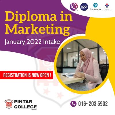 pintar admin2021-11-24T04:46:20+00:00January 2022 Intake for Diploma in Marketing is now open for application! This programme provides students with fundamental broad-based knowledge, both academic and vocational of the complexities of businesses in the marketplace. Start Register and Grab this opportunity now!